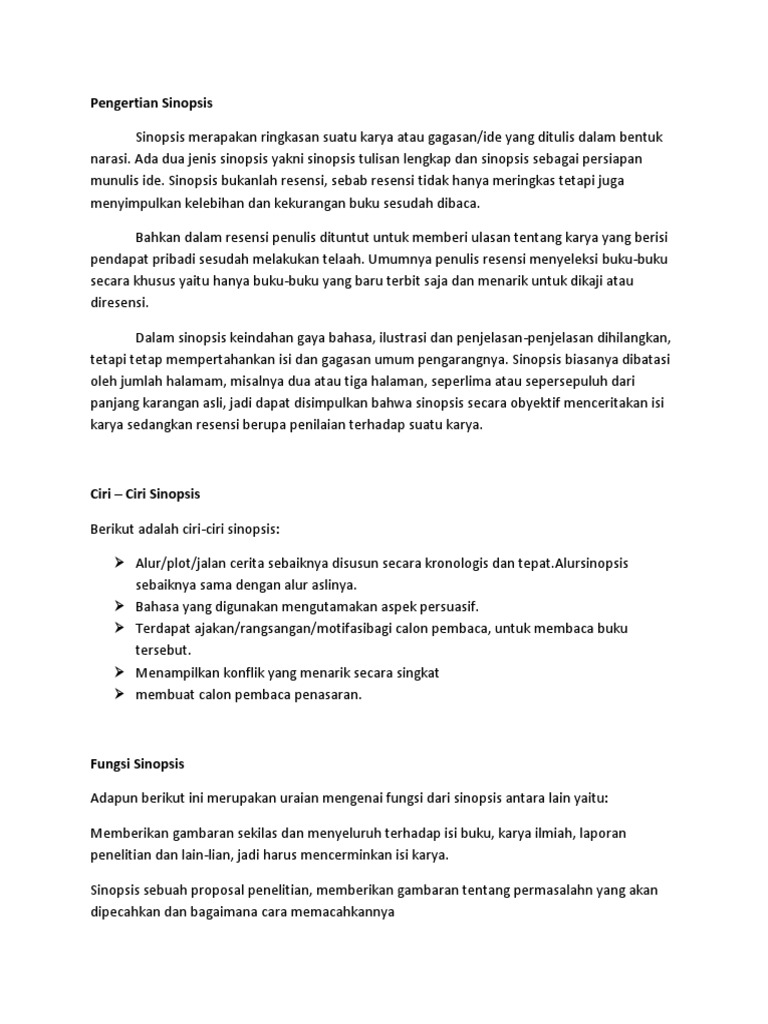Sinopsis Adalah Pengertian Fungsi Ciri Contoh Cara Membuat from pengajar.co.id Sinopsis novel merupakan ringkasan cerita novel. Sinopsis berbeda dengan resensi karena tidak hanya meringkas namun juga membuat kesimpulan dari kelebihan atau kekurangan sebuah buku setelah dibaca. Sinopsis memiliki arti dalam kelas nomina atau kata benda sehingga sinopsis dapat menyatakan nama dari seseorang, tempat, atau semua benda dan. Sinopsis adalah ringkasan dari sebuah karya atau ide yang ditulis dalam bentuk narasi. Sinopsis punya peran penting dalam penggambaran sebuah karya.sinopsis adalah bagian yang juga sering disertakan dalam ulasan atau laporan. Menurut ahli bahasa yang lahir dari nusa tenggara timur, dr gorys keraf, pengertian sinopsis adalah summary atau ringkasan yang menyajikan ulasan yang lebih pendek, sederhana dan menarik. Sinopsis berasal dari kata synopical yang artinya ringkas. Jadi, sinopsis adalah ringkasan isi naskah cerita yang menggambarkan isi cerita dari suatu karya baik itu buku, film atau pementasan dari awal sampai.