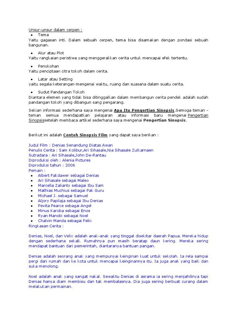 Setiap pembuatan sinopsis harus memiliki ciri. Pelaku cerita contoh sinopsis kali ini, saya yg merangkum dari novel rumah baru vinka. Setiap pembuatan sinopsis harus memiliki ciri. Membuat sinopsis merupakan suatu cara yang efektif untuk menyajikan karangan (novel) yang panjang dalam bentuk yang singkat. Bentuk dari sinopsis biasanya singkat, padat, dan jelas. Jika kalian ingin membuat sinopsis, jangan lupa tentukan dulu tema, latar, alur, dan penokohannya.tema : Sinopsis adalah ringkasan dari sebuah karya atau ide yang ditulis dalam bentuk narasi. Sinopsis merapakan ringkasan suatu karya atau gagasan/ide yang ditulis dalam bentuk narasi. Membuat sinopsis adalah suatu cara yang efektif untuk menyajikan karangan (novel) yang panjang dalam bentuk singkat. Maka hasil sinopsis adalah sebuah karangan pendek sesuai dengan karangan. Sinopsis berbeda dengan resensi karena tidak hanya meringkas namun juga membuat kesimpulan dari kelebihan atau kekurangan sebuah buku setelah dibaca. Arti lainnya dari sinopsis adalah ringkasan. Sinopsis adalah ringkasan suatu karya atau gagasan/ide yang ditulis dalam bentuk narasi.
